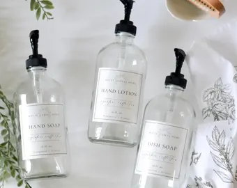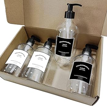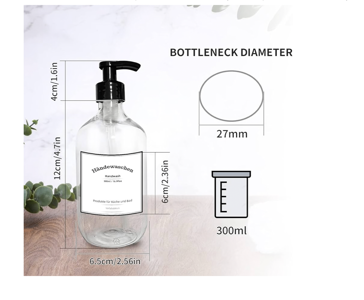 30) Set of 4 Plastic Soap Dispensers, 300 ml, Bottle with Labels, Hand Soap, Shampoo, Shower Gel, Dish Detergent Dispenser for Bathroom, Kitchen Countertop, Office, Hotel (Transparent, 300 ml)