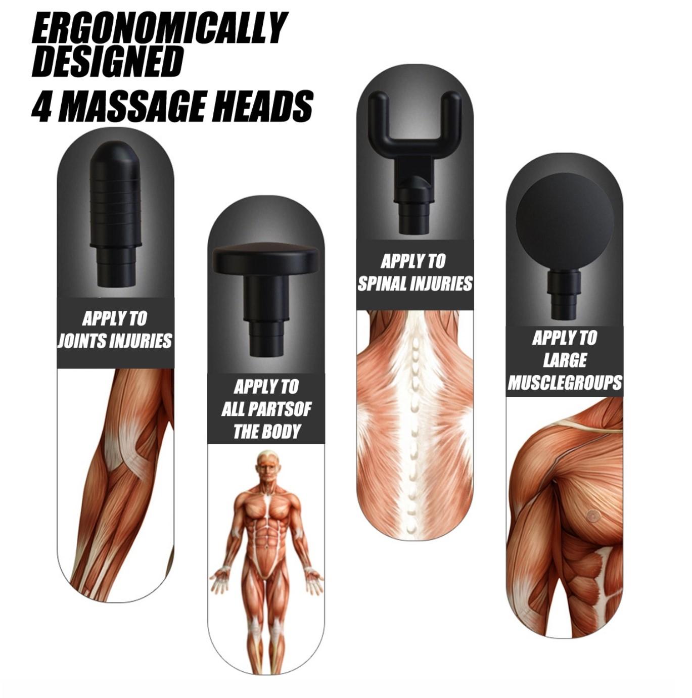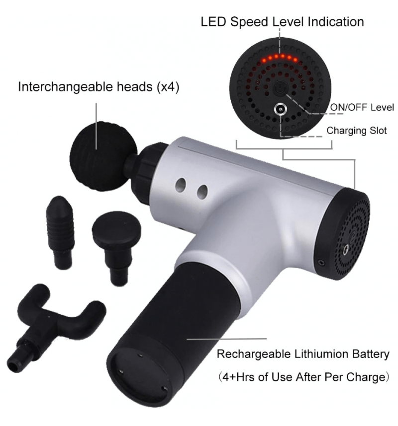 مسدس التدليك Fascial Gun FH-320 هو جهاز تدليك إيقاعي لاسلكي مصمّم لاستعادة العضلات العميقة بعد التمارين الرياضية أو الأيام الطويلة المُرهقة. بفضل 6 مستويات سرعة قابلة للتعديل تتراوح من 2100 إلى 3600 دورة في الدقيقة، يوفّر علاجاً اهتزازياً مركّزاً يساعد على تخفيف توتر العضلات وتقليل الألم وتحسين الدورة الدموية وتسريع وقت التعافي. سواء كنت رياضياً أو من روّاد الصالات الرياضية أو شخصاً يجلس طويلاً خلف المكتب، هذا الجهاز يمنحك راحة عضلية بمستوى احترافي.تأتي العبوة مع 4 رؤوس تدليك قابلة للتبديل — كل واحدة مصممة لمنطقة مختلفة من الجسم. الرأس الكروي مناسب للمجموعات العضلية الكبيرة كالفخذ والظهر، والرأس المسطح للاسترخاء العام، والرأس المخروطي لنقاط الألم العميقة والمفاصل، والرأس الشوكي لمنطقة العمود الفقري والرقبة. البطارية المدمجة بسعة 2500 ملّي أمبير توفّر 4-5 ساعات من الاستخدام المتواصل بشحنة واحدة، مما يجعله محمولاً بالكامل بدون أسلاك.
