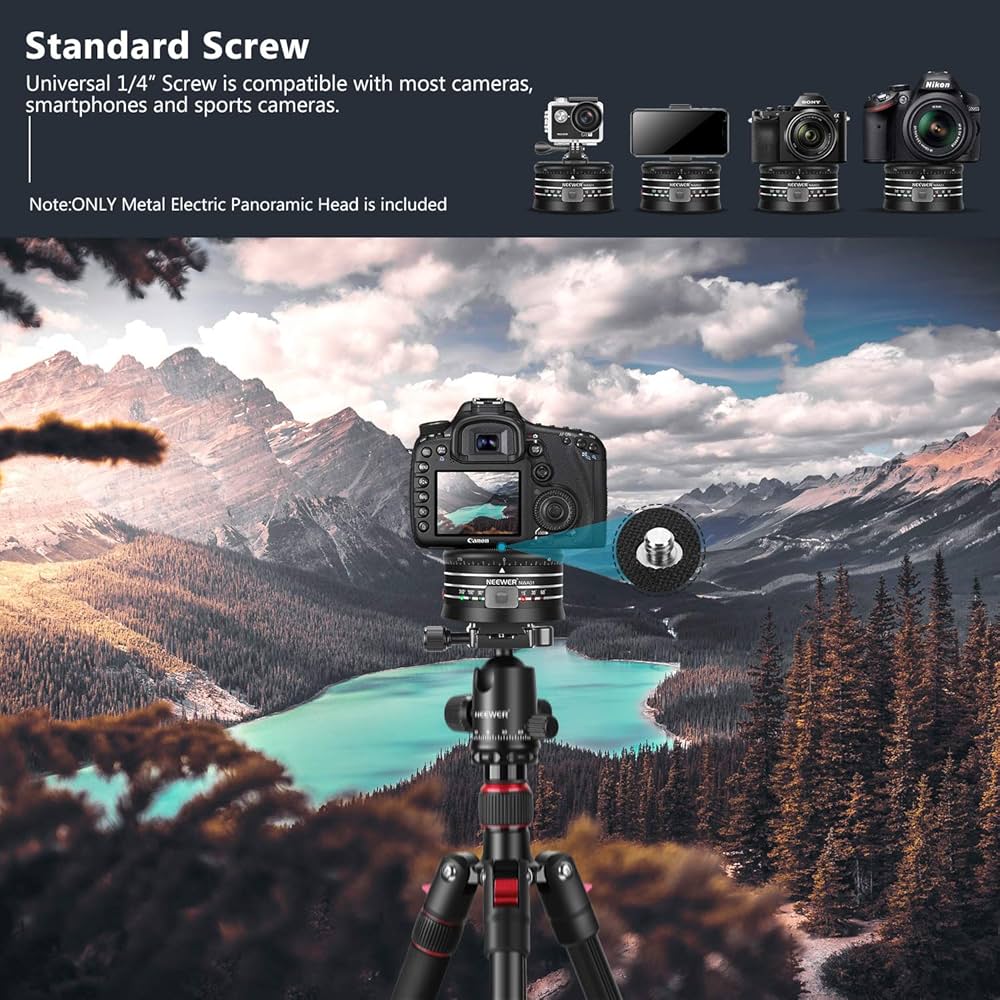 Whether you're using your digital camera, GoPro or a smartphone, this Neewer Panoramic Motor Tripod Head brings easy balance to every recording session. Amateur and pro photographers and videographers can achieve more advanced effects including beautiful panoramic landscapes, cool time-lapse videos, and super smooth panning across any indoor or outdoor set. Just set your precise degree of rotation and desired run time, and press start.