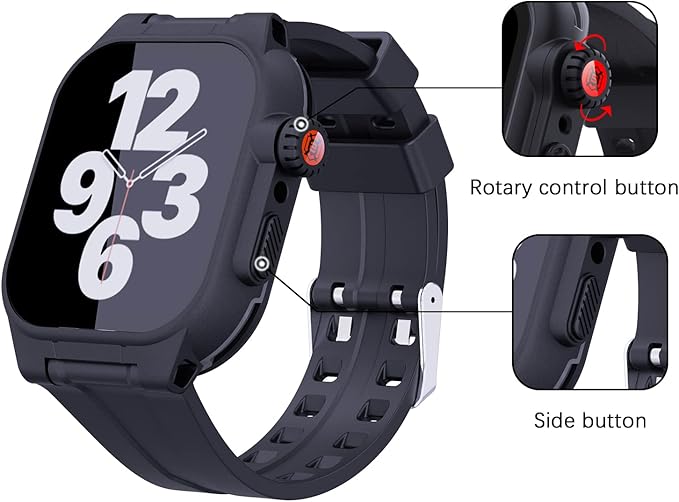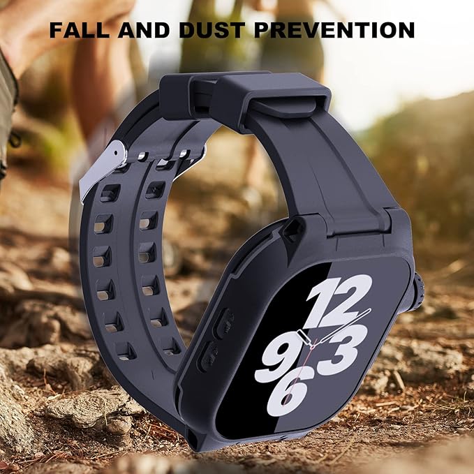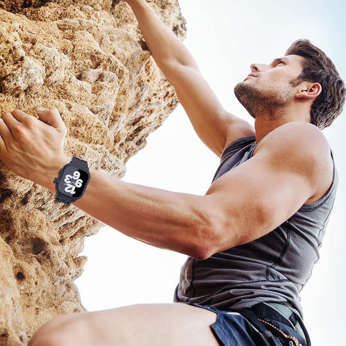 The case features a hard PC front cover with a built-in touch-sensitive screen protector that prevents scratches while maintaining full touchscreen responsiveness. The soft TPU back cover is transparent, ensuring wireless charging and heart rate monitoring continue to work without removing the case. All buttons and the Digital Crown remain fully accessible through precisely engineered cutouts. The included double-row perforated silicone sport band is breathable, comfortable for all-day wear, and adjustable to fit most wrist sizes.