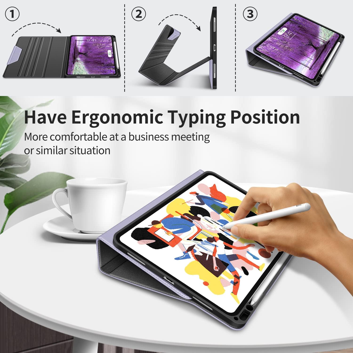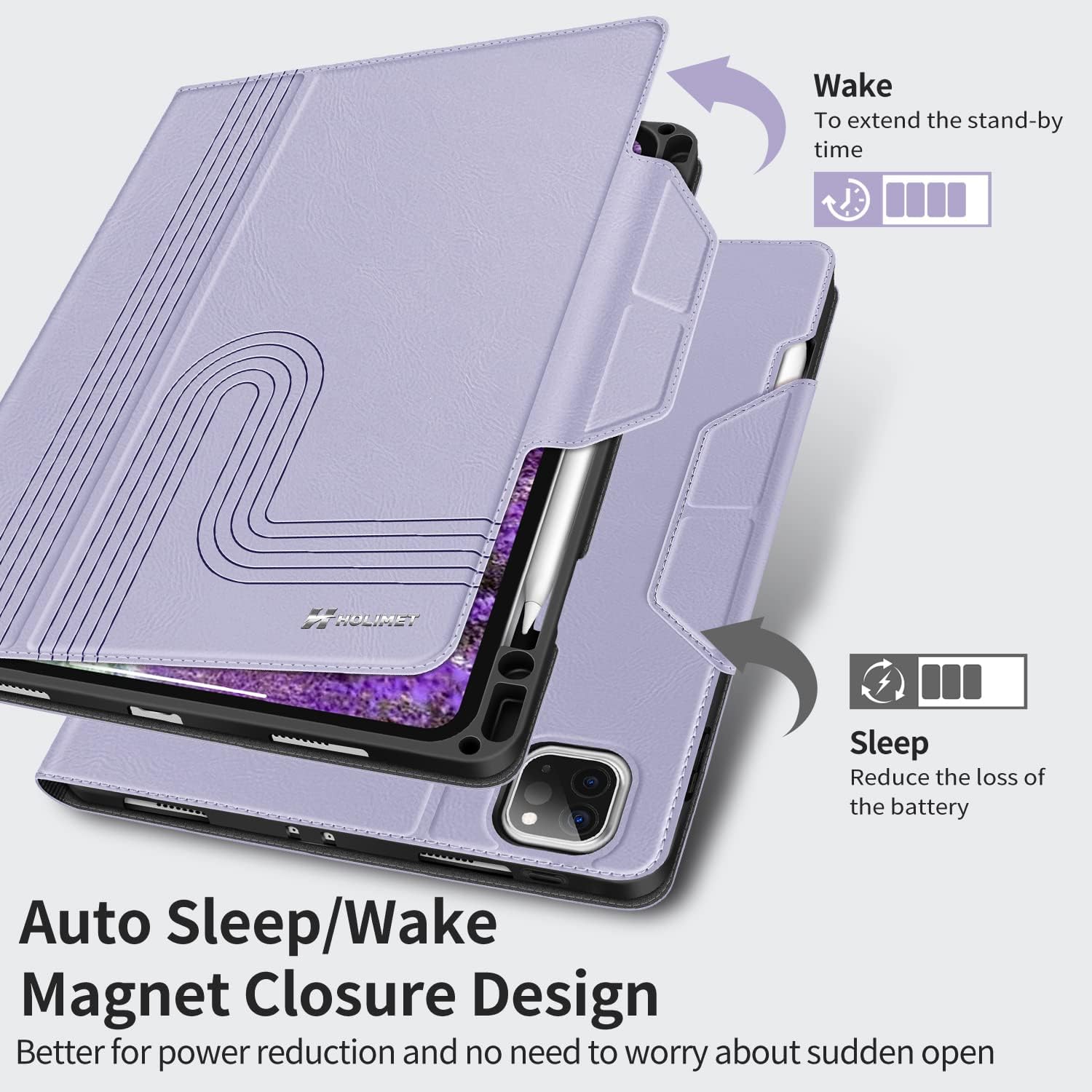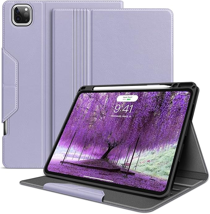 The H HOLIMET Table Case is a premium protective folio case designed specifically for the iPad Pro 11-inch (1st through 4th generation, 2018–2022). It combines elegant lilac/purple vegan leather styling with serious all-round protection — the soft TPU back shell absorbs shocks and bumps while the PU leather exterior guards against scratches, dirt, and daily wear. The case snaps on easily and can be removed without effort.