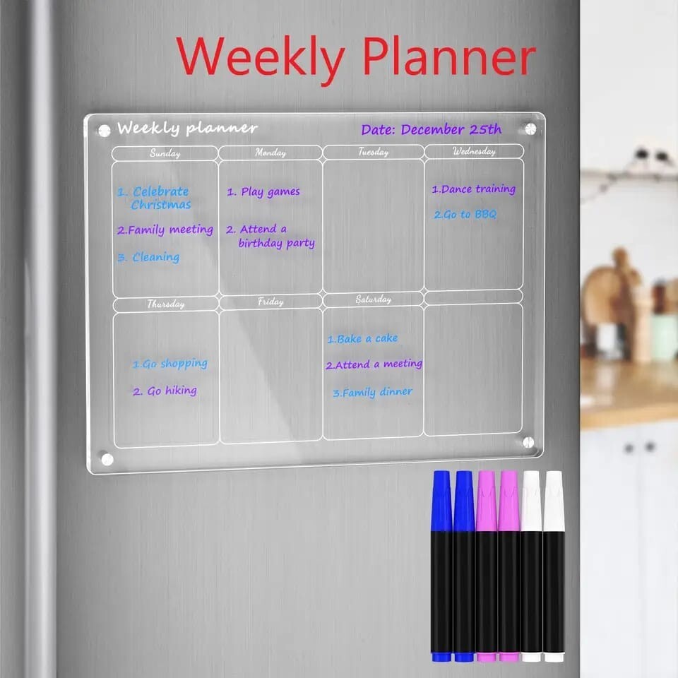 Magnetic Monthly & Weekly Calendars Set】This set of acrylic monthly and weekly calendar for fridge was designed to make planning your daily life easier. The dry erase board and magnetic calendar for fridge allow you to record your weekly plans, monthly activities, shopping lists and crucial information in an organized way to keep your wonderful life in order.