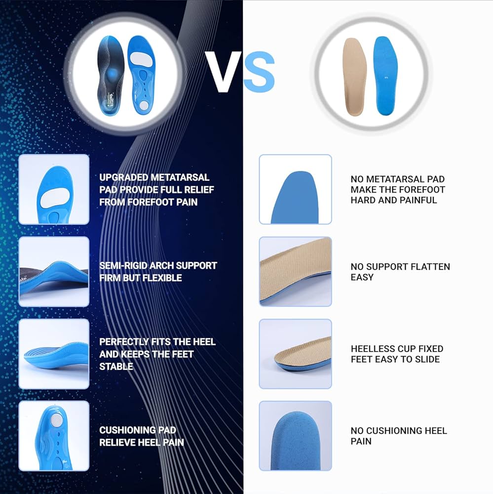 [👣FOOT PAIN RELIEF]These supportive shoe insoles are the ideal orthotics for mild to moderate flat feet, pronation, metatarsal pain, heel spur and arch discomfort, sore and tired feet, foot pain associated with plantar fasciitis, and other common foot conditions.Foot Pain goes away quickly after wearing this insole.