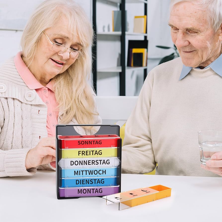 SLIDABLE DESIGN You only need to slide the pill box out from the bottom and put it back up after use. The day boxes can be easily removed and pushed on. Good for people with rheumatism and motor disabilities.