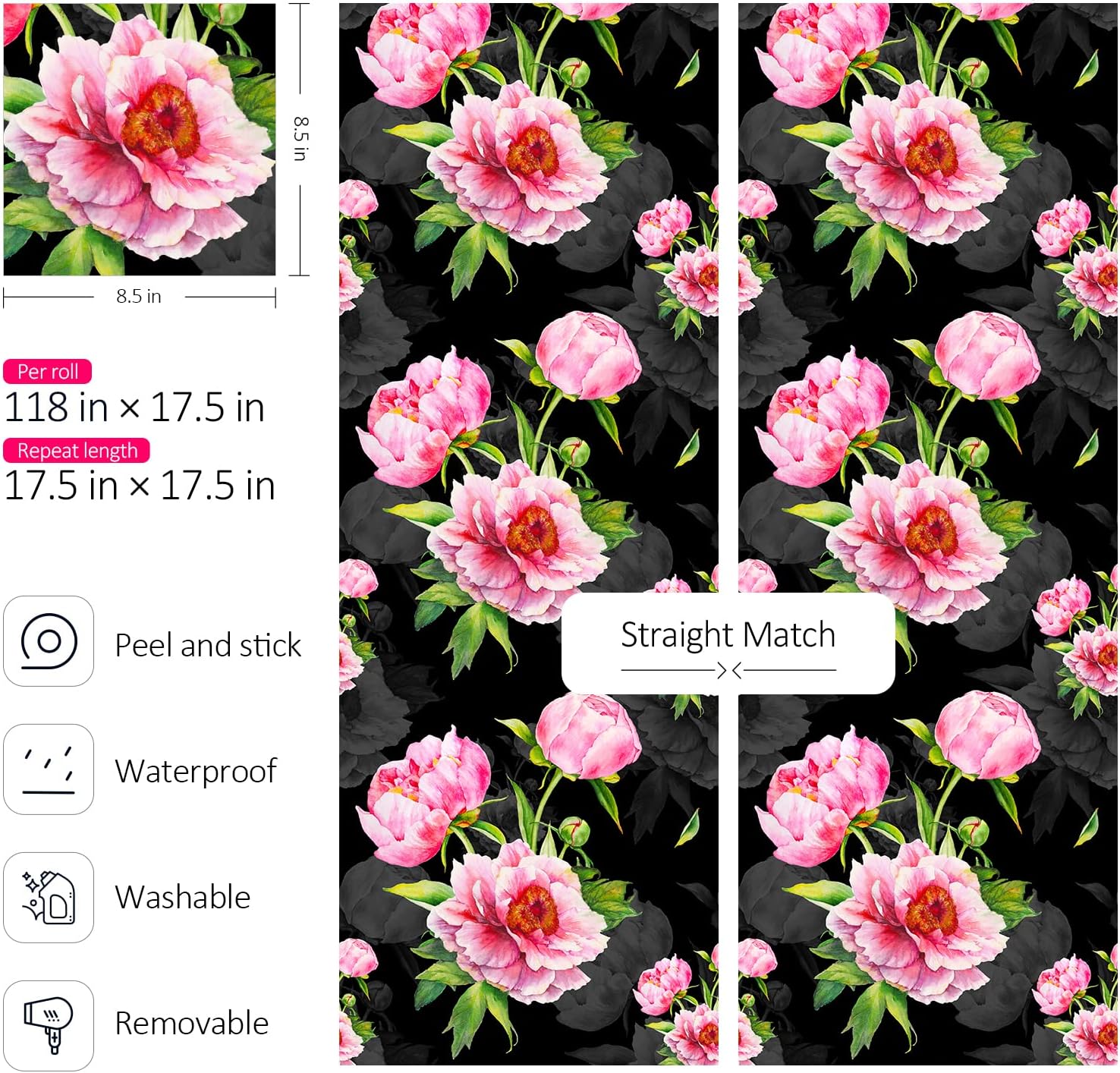【Dark floral wallpaper】🏈Size: 17.5in x 23ft covers 33.5 sq.ft per wallpaper roll. Material: PVC. The black floral wallpaper peel and stick is Waterproof / Oil proof / Prepasted / Removable/ Straight match. Renter friendly.