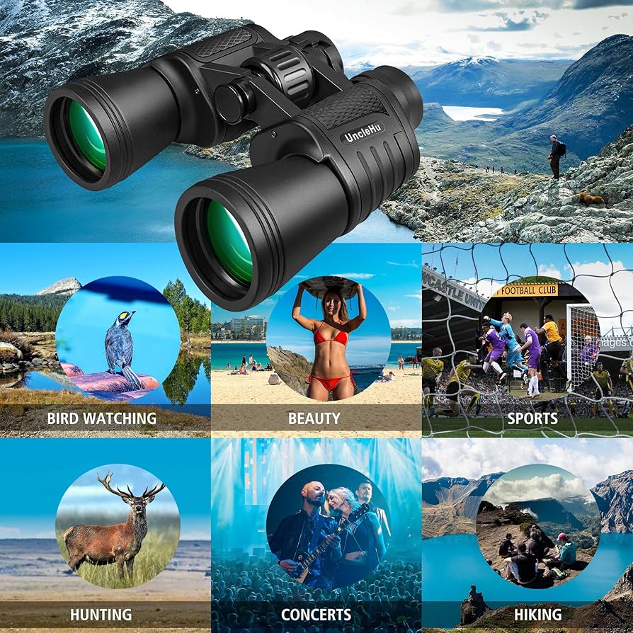 【Powerful Binoculars - 26mm Large Lens】26mm eye lens diameter and 50mm objective lens diameter, large field of view. 26mm eye lens collect more lights than others (e.g. 10x25, 12x25, 15x25 binoculars and ordinary 10x42, 12x42 binoculars), delivering clearer and brighter view. Perfect binoculars for adults bird watching, hunting, camping, hiking, sports and stargazing.