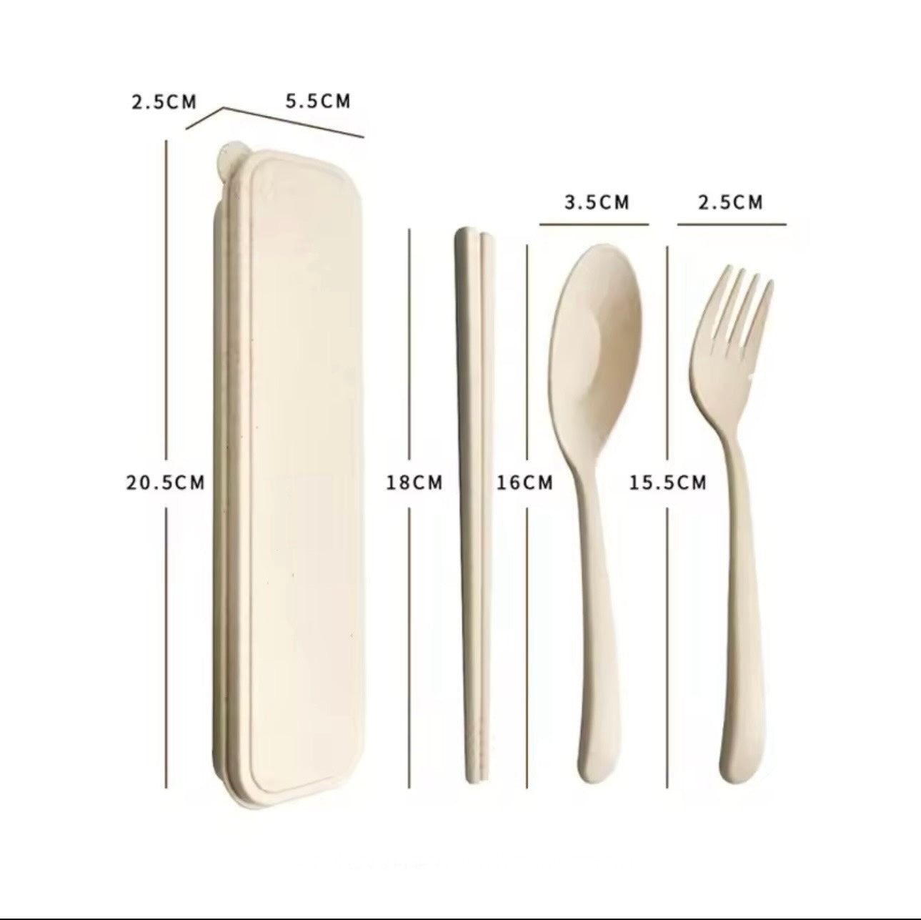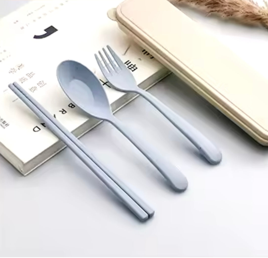 The set contains: a spoon, a fork, and two small chopsticks, all made from recycled materials.