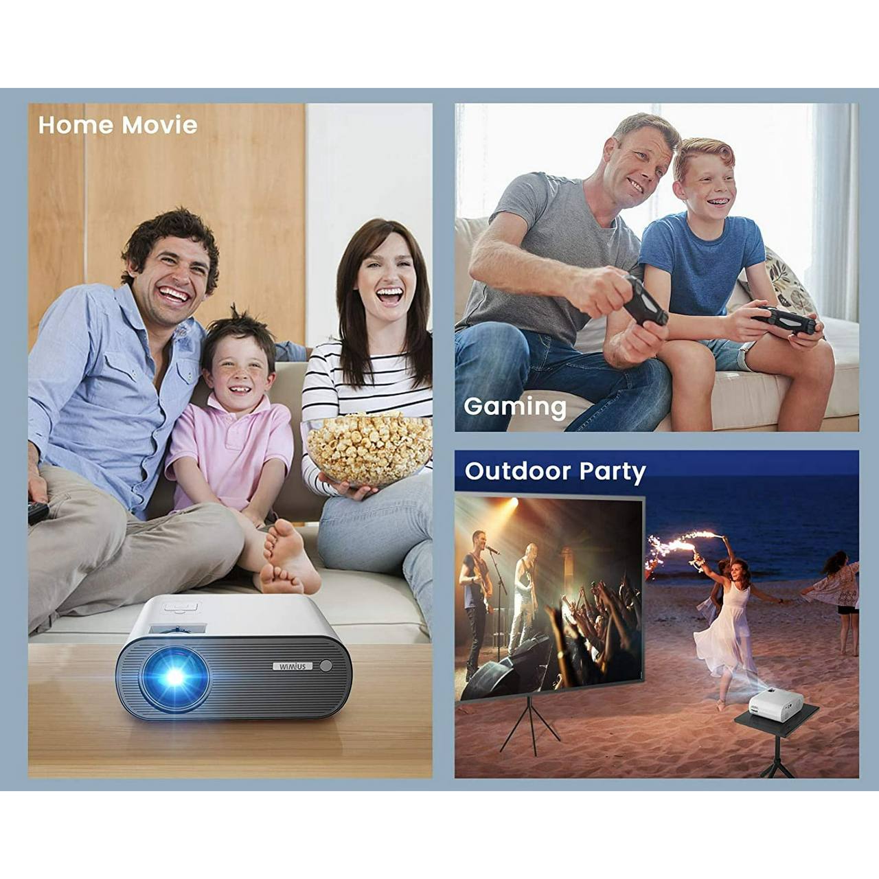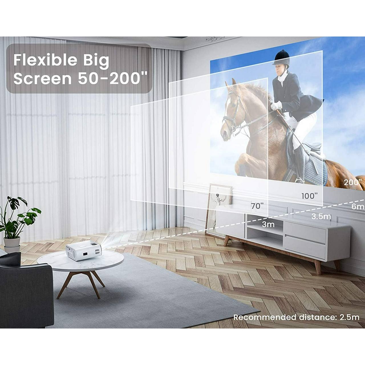 A compact mini projector with WiFi and Bluetooth 5.0, supporting Full HD 1080P resolution. 20% brighter than similar projectors with a 9000:1 contrast ratio for sharp, realistic picture quality. Connects wirelessly to iPhone, Android, laptops, Bluetooth speakers and AirPods. Projects 50" to 200" screen size with a 75%-100% zoom function so you don't need to move the projector. Comes with USB, HDMI, AV, and 3.5mm audio ports plus a carrying bag included. Perfect for movie nights, gaming, and presentations at home or on the go.